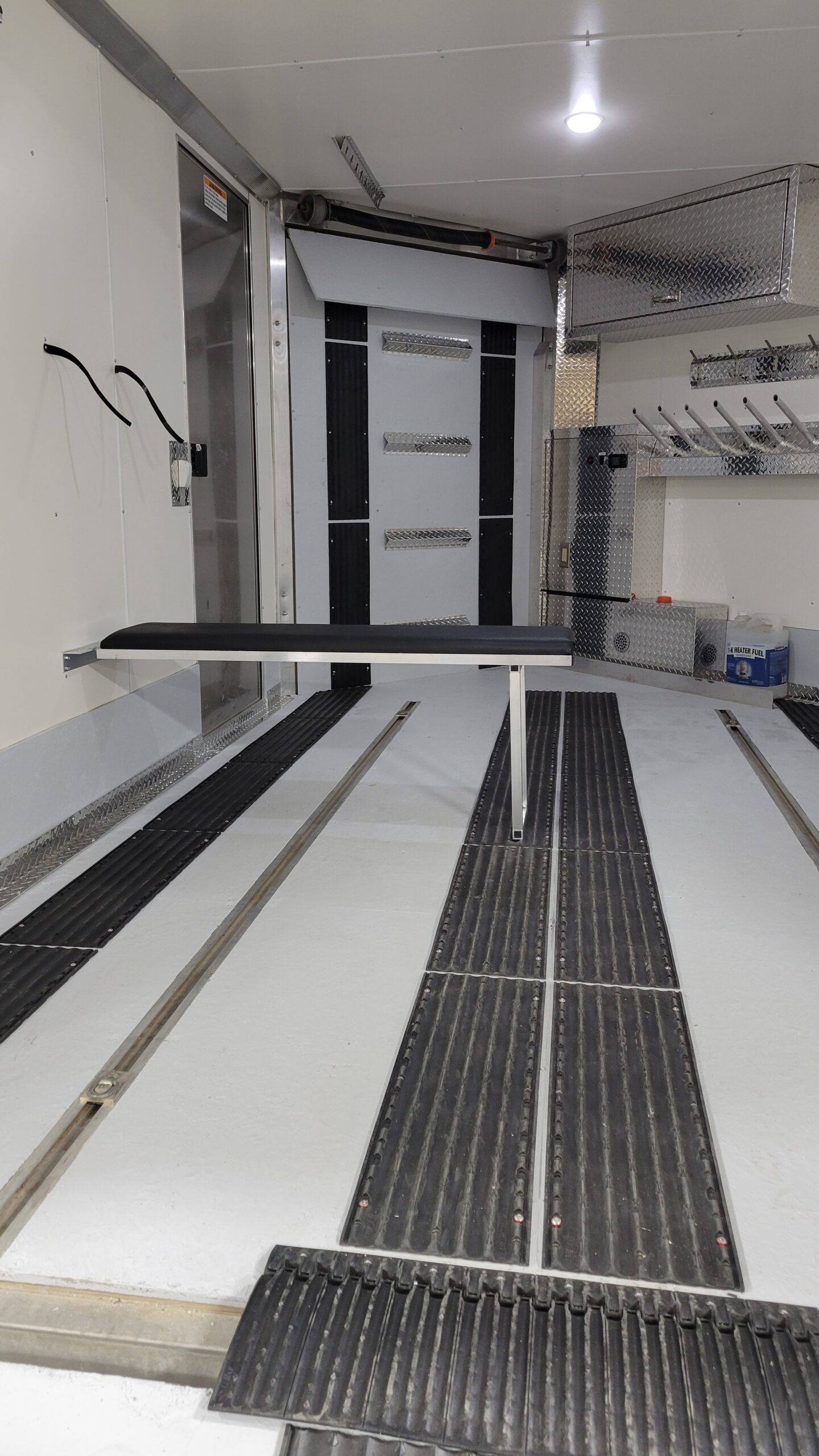 Measuring 12 inches in width and 48 inches in length, this folding bench offers a sturdy place to sit while relaxing or getting ready for a big day of riding.  Easily folds up to the wall for storage during transporting with a loaded trailer.